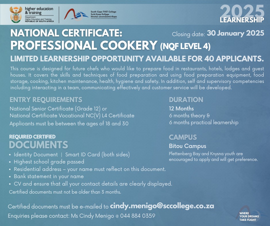 There is a limited Learnership opportunity available for 40 applicants to join a National Certificate: Professional Cookery (NQF Level 4) which runs over 12 months.